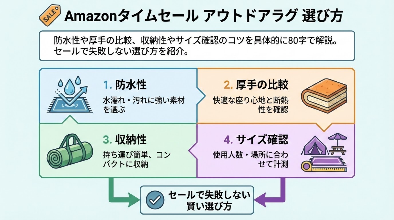 Amazonタイムセール アウトドアラグ 選び方を一言で言うと、用途に合う素材とサイズを決めておくことが勝負の分かれ目です。要点は次の3つです:サイズ、収納性、デザイン。私も準備不足で選び直した経験があるので、先に決めておくと安心できます。