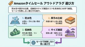Amazonタイムセール アウトドアラグ 選び方の基準は、主に防水性、厚み(クッション性)、そして洗濯や手入れのしやすさです。判断基準は、設営場所(湿地か砂利か)と使用時間の長さで決めましょう。チェックリスト:裏面防水か、厚みは何mmか、洗濯表示を必ず確認。