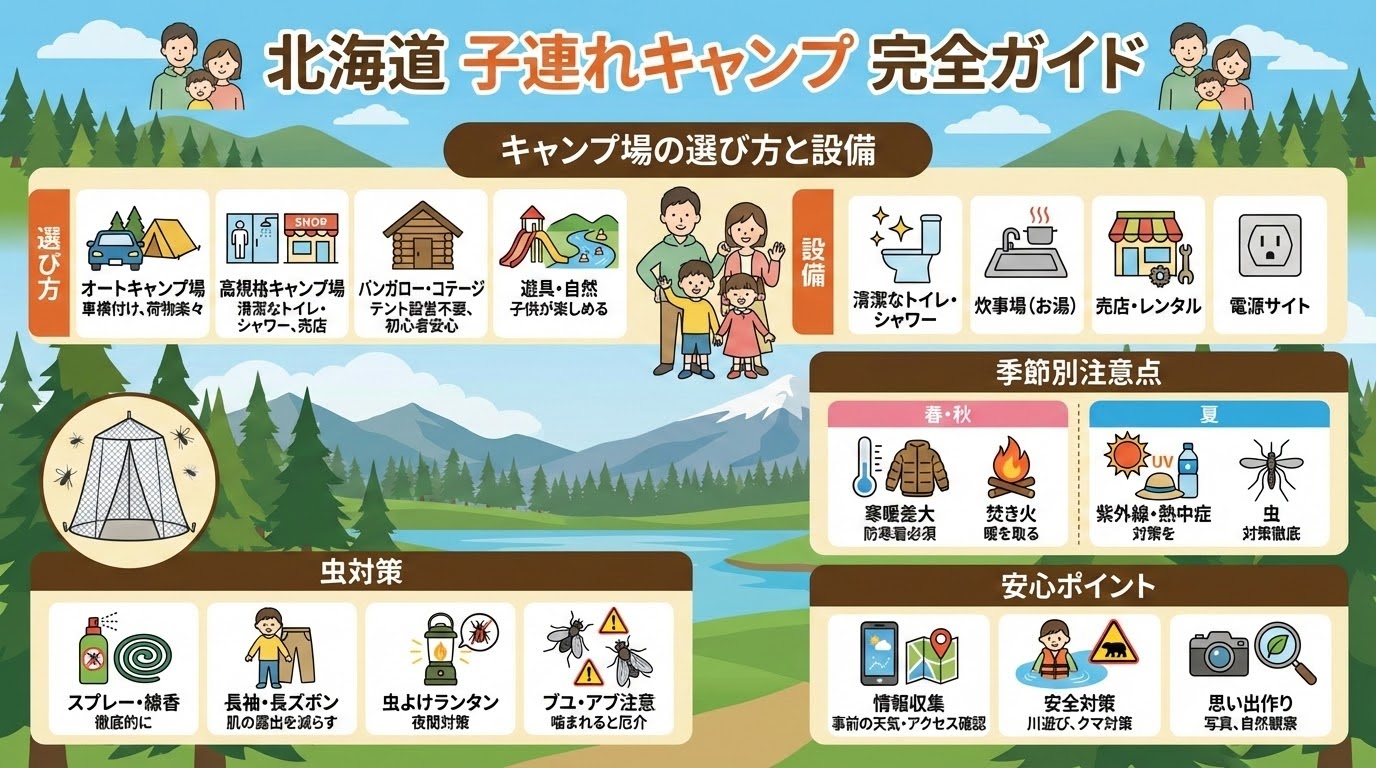 北海道 子連れ キャンプ場を選ぶ際は、安全対策と設備の充実、そして季節に応じた準備がポイントです。子どもが楽しめる工夫がある施設を優先し、天候や虫の発生情報を出発前に確認する習慣をつけましょう。