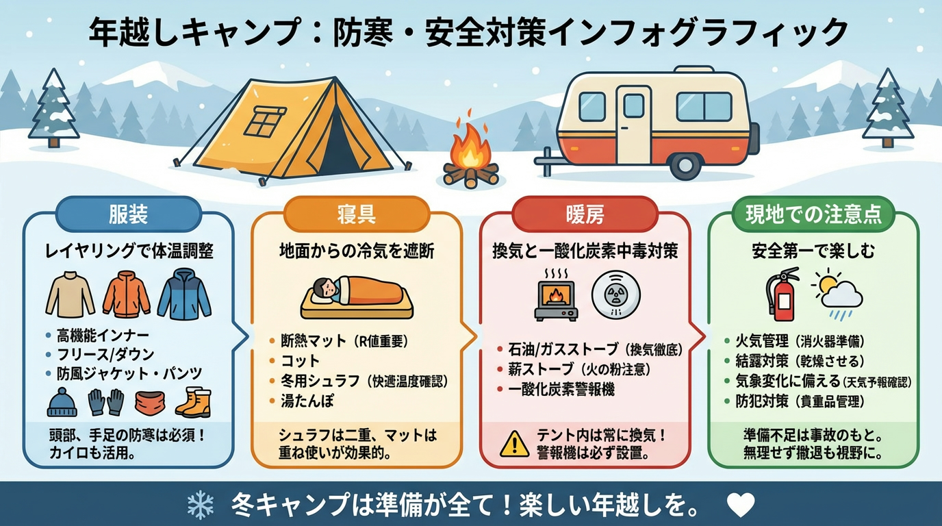 対象読者:年末年始にキャンプを計画している方、冬の装備に不安がある方。
