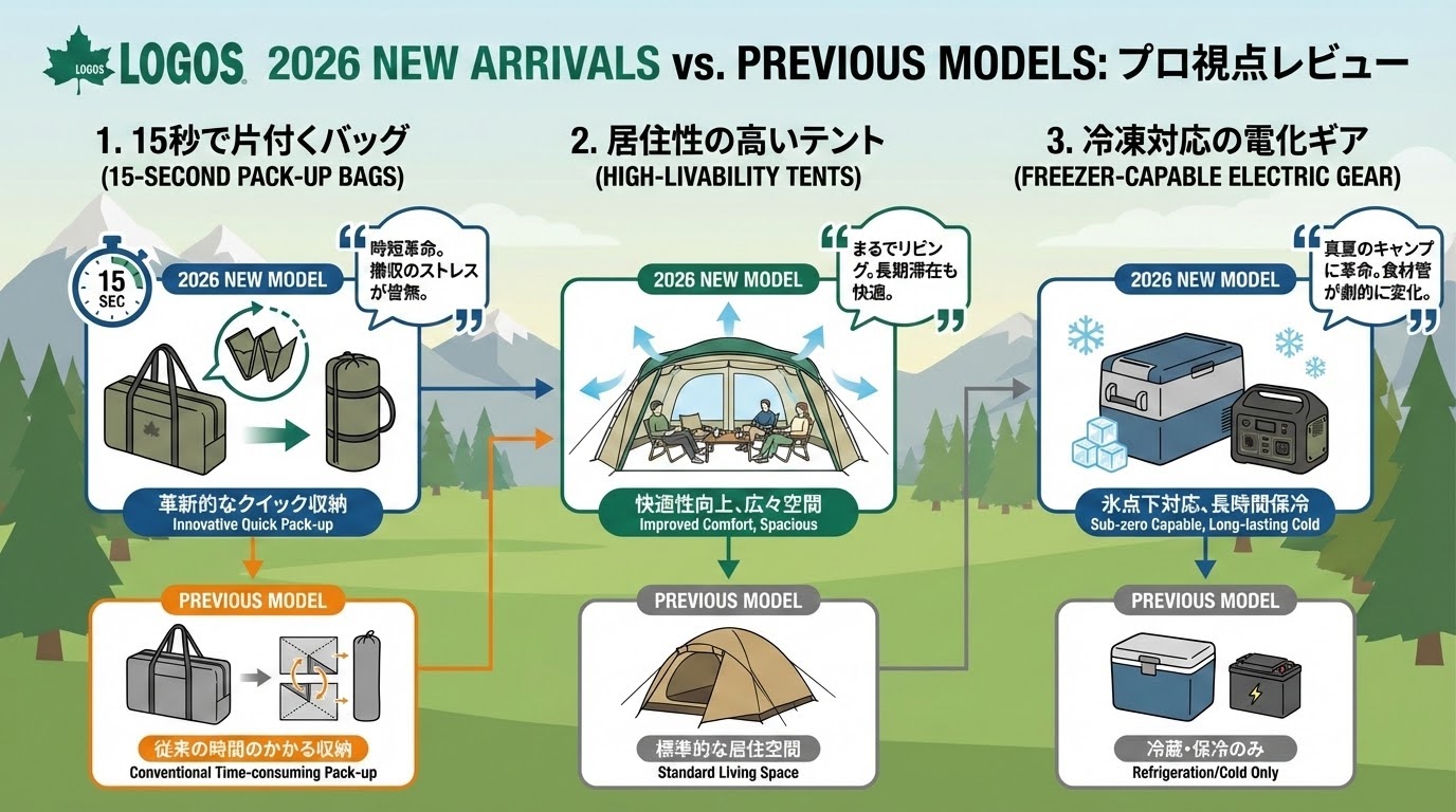 ロゴス 2026 新作 旧モデル 違いを知ることで、あなたのキャンプがもっと快適になりますよ!経験豊富なアウトドアマンとして、最新の注目ギアを分かりやすくご紹介します。✨