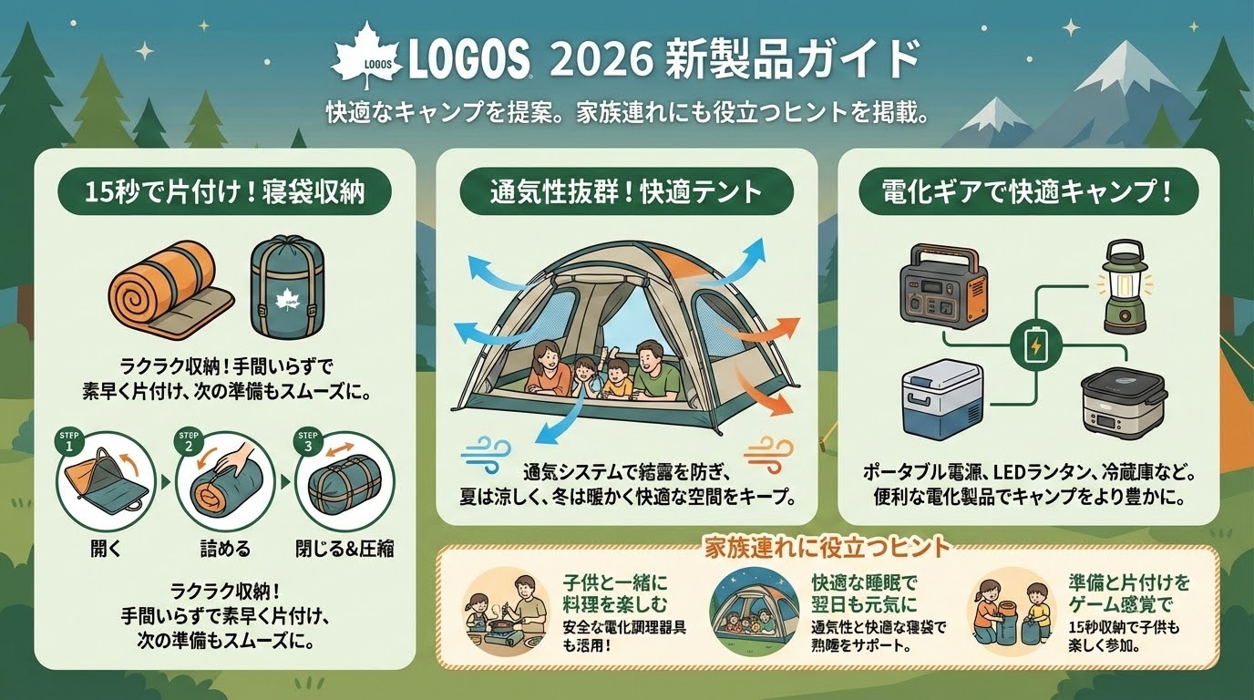 ロゴス2026新製品の選び方:結論:撤収の時短と電化での快適性が向上したラインナップです。