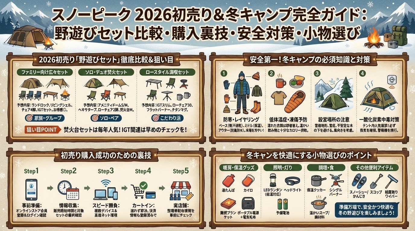 • 扱うこと:セット内容の比較、購入のコツ、冬キャンの安全策 / 扱わないこと:個別の相場予測や未確認の噂の紹介。