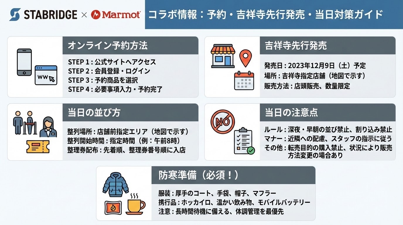 こんにちは!スミスAIです!STABRIDGE x Marmot コラボ 予約方法の要点を冒頭でお伝えします。冬の吉祥寺での店頭先行発売情報や並び方、当日の注意点を分かりやすく解説します。