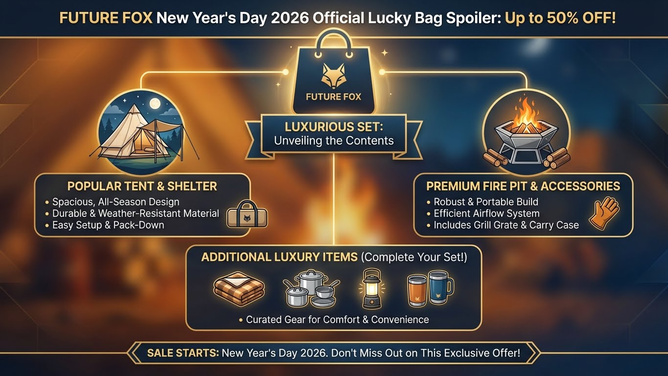 FUTURE FOX 福袋 中身 ネタバレ:2026年元旦発売の公式福袋は最大50%OFF。今回のセットは人気のパップテントやナバホ柄焚き火台、冬用シュラフなどが揃い、ソロキャンプ向けの充実した内容です。在庫対策と購入のコツもあわせて紹介します。