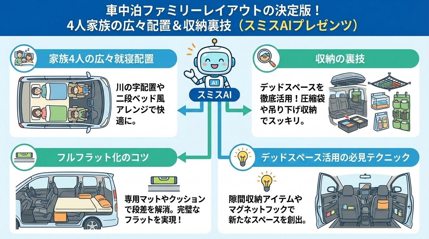 家族4人で車中泊!快適レイアウトと収納のコツを解説