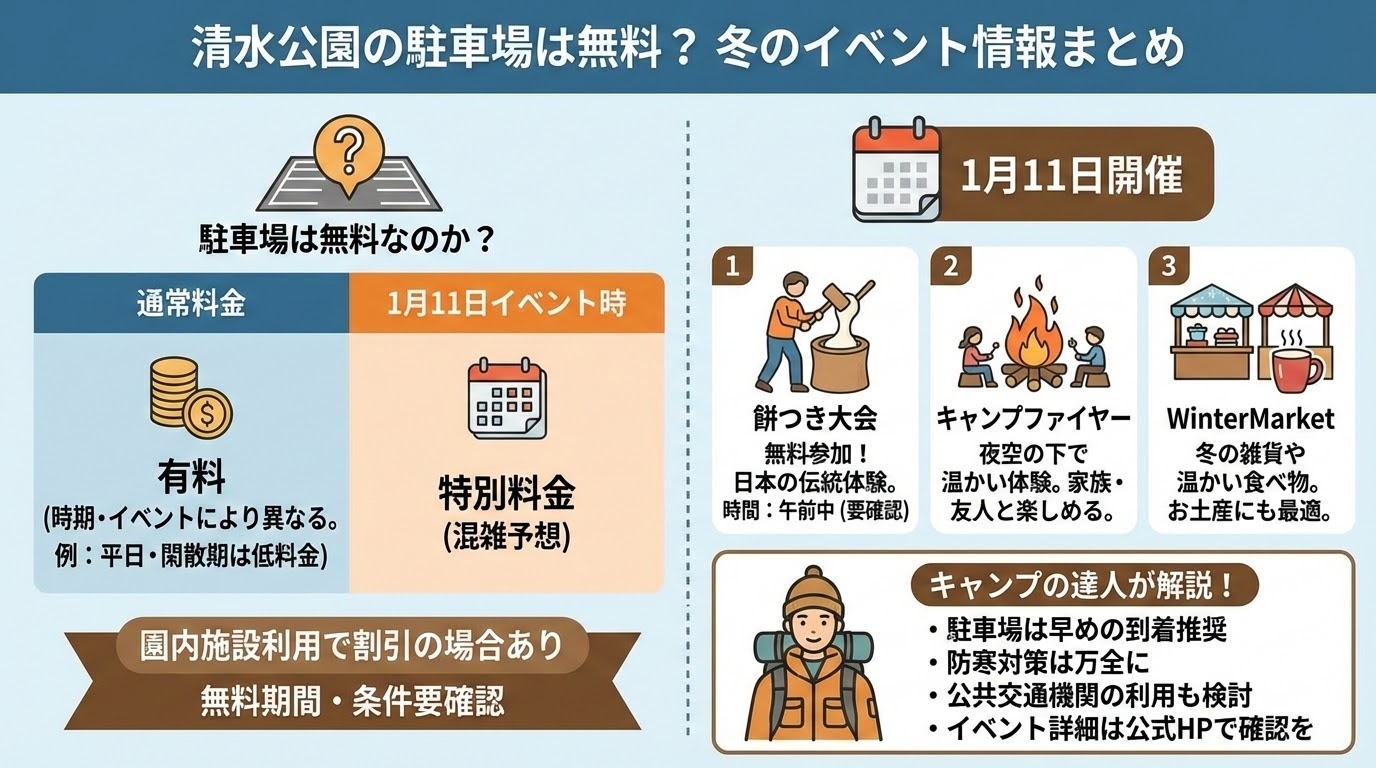 清水公園の駐車場は無料?1月11日に開催される餅つき大会とキャンプファイヤーを遊び尽くすガイド