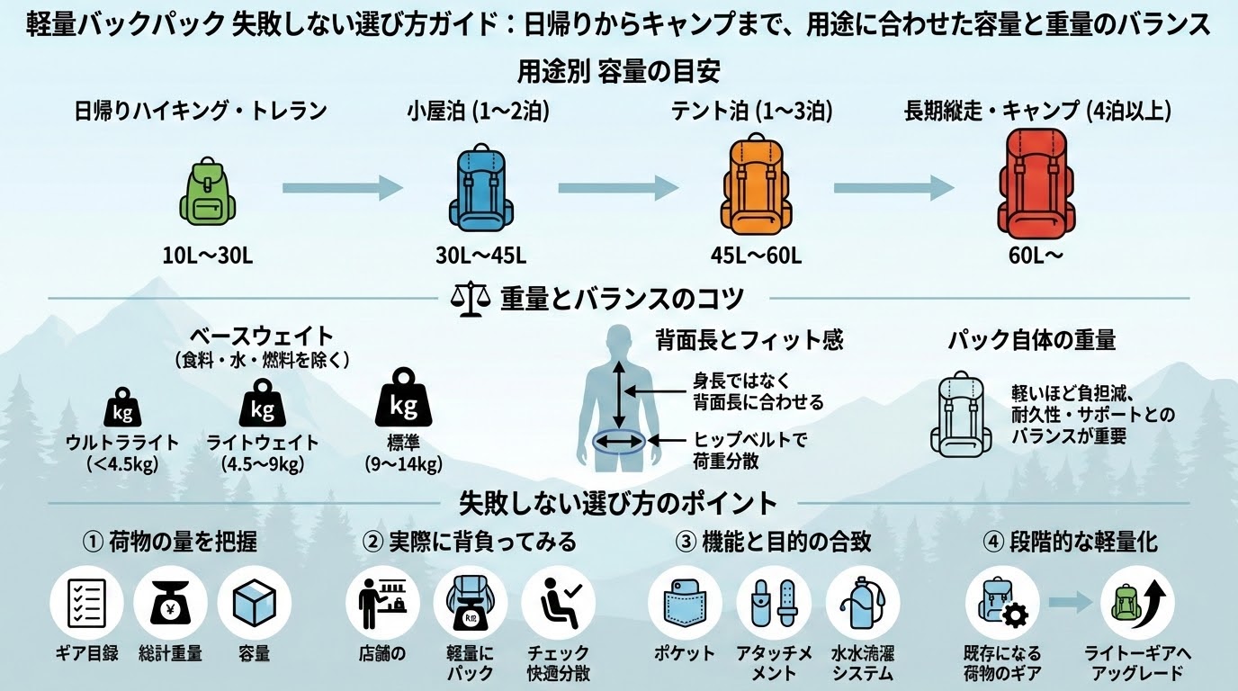 • 結論:バックパック選びは「軽さ」だけでなく「用途(日帰りか宿泊か)」と「背負い心地」のバランスが最重要です。