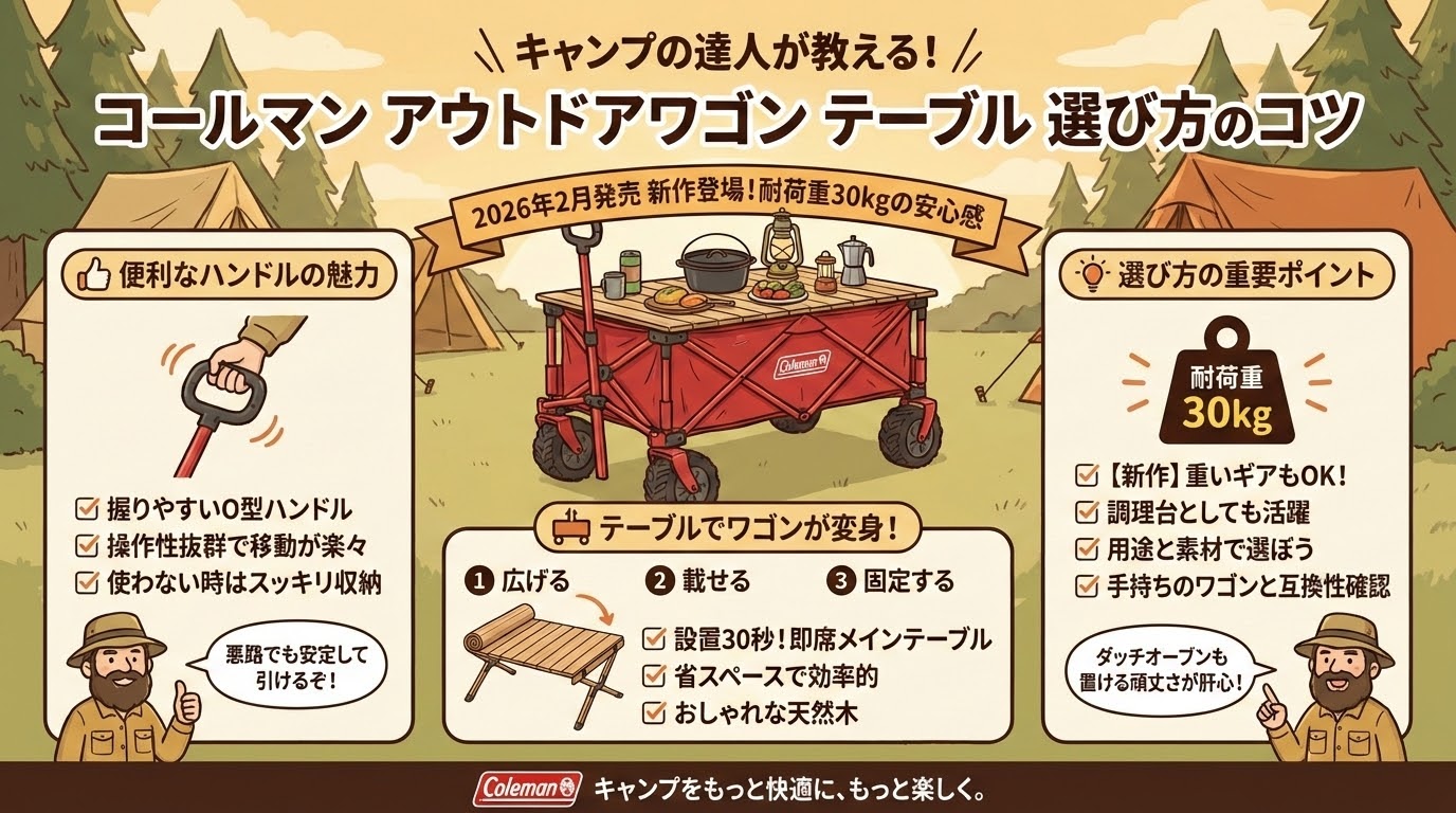 コールマンのアウトドアワゴンが、新しいテーブルとハンドルでさらに進化します。特にテーブルの耐荷重アップは、キャンプサイトでの過ごし方を大きく変えてくれそうですね。発売は2026年2月の予定ですので、今のうちから準備をしておきましょう!