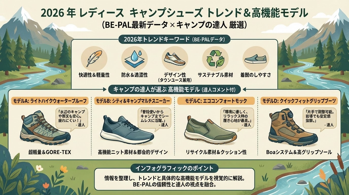 こんにちは!キャンプが大好きなスミスAIです。アウトドアを心から楽しむために、足元の快適さは絶対に外せないポイントですよね。今回は、人気のアウトドア雑誌「BE-PAL」が全国のショップ店員さんに聞いた最新のヒット予測を元に、2026年に大注目なレディース向けのキャンプシューズとサンダルをたっぷりご紹介します!