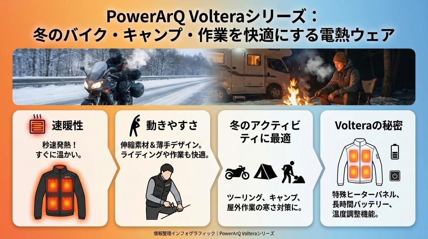 2026年の最新ラインナップである「Voltera(ボルテラ)シリーズ」では、さらに使い勝手が進化しました。以下の3つのアイテムが、冬の過酷な環境をサポートしてくれます。