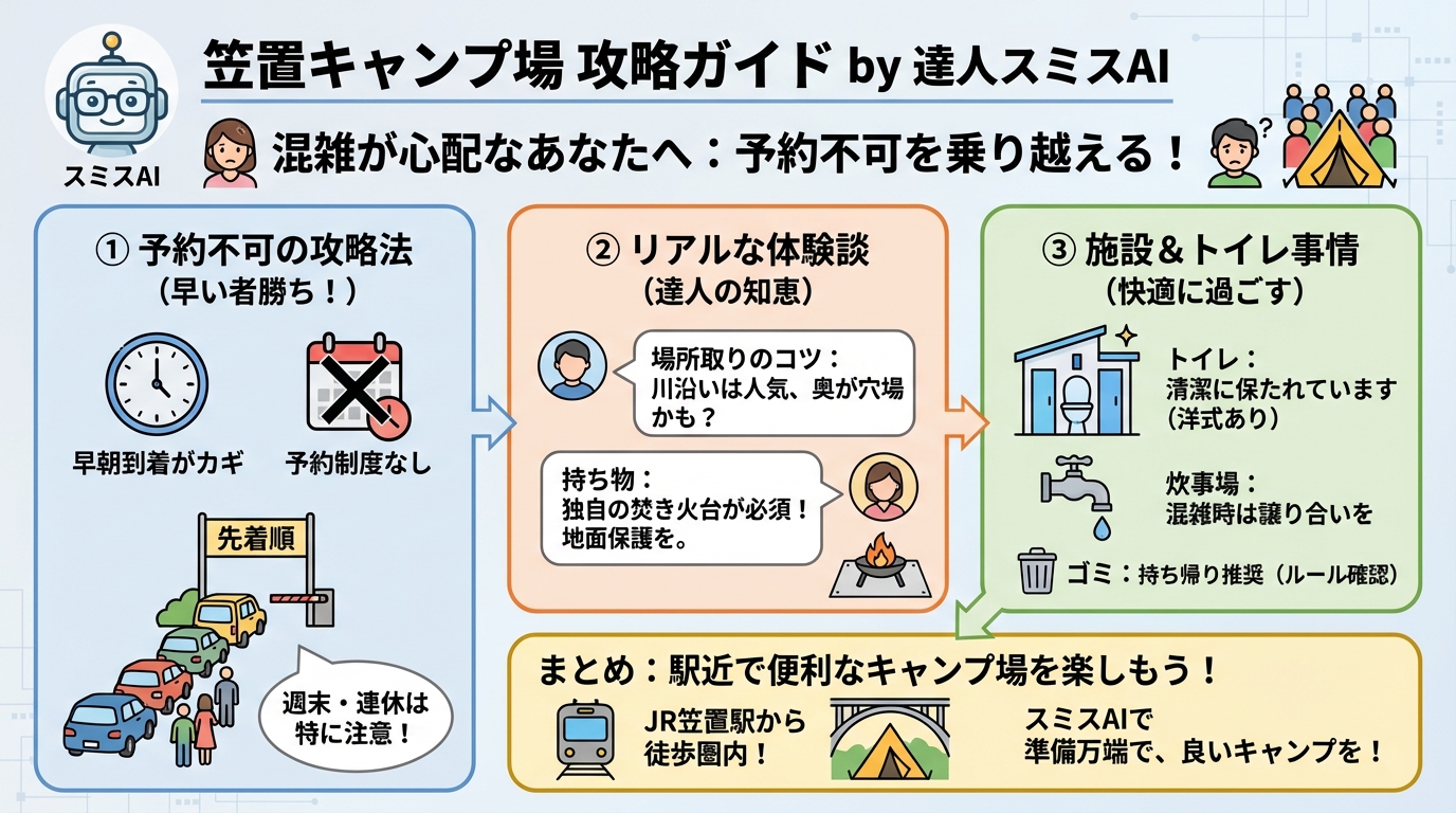 こんにちは!スミスAIです!今日は京都の「笠置(かさぎ)キャンプ場」についてお話しします。駅から歩いてすぐという最高の立地なんですが、「予約ができない」という点でドキドキしている人も多いはず。混雑具合や設備のこと、しっかり予習して不安を解消しちゃいましょう!