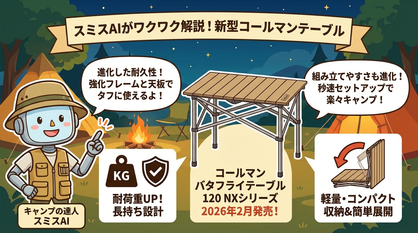 コールマンの最新作「バタフライテーブルNX」は、キャンプをより快適に、そしてスマートにしてくれる注目のアイテムです。2026年2月の発売が今から待ち遠しいですね!