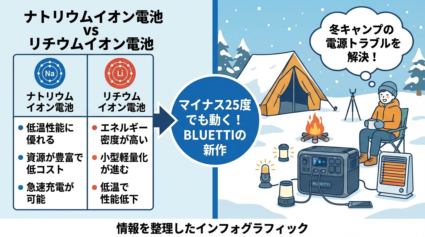 ナトリウムイオン電池とリチウムイオン電池の違いは?冬キャンプの革命児が登場!