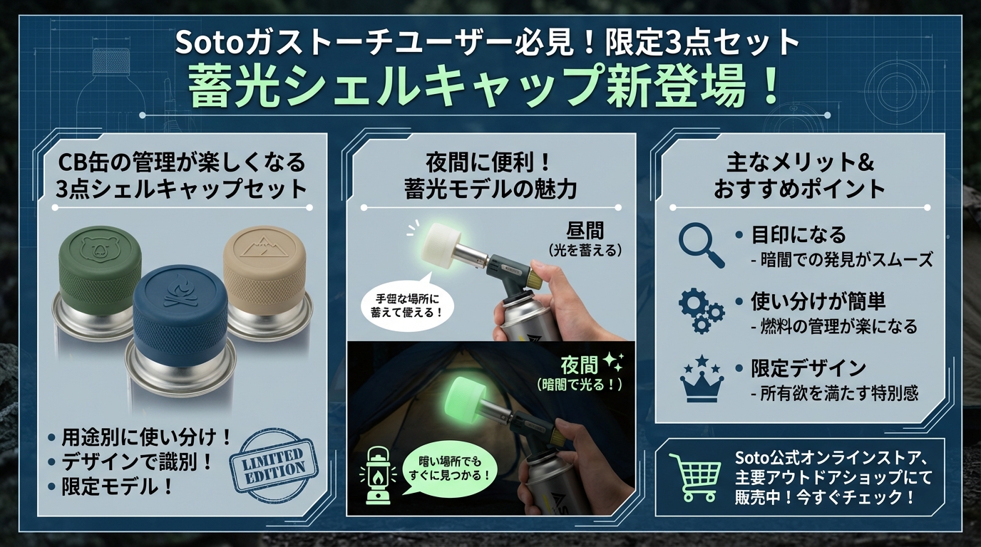 SOTOの「シェルキャップ限定3点セット」は、実用性と遊び心を兼ね備えた、キャンパーの「欲しかった!」を形にしたアイテムです。数量限定での販売なので、気になる方は早めにチェックしてくださいね。お気に入りのギアを大切に使うことで、キャンプの時間はもっと楽しく、もっと特別なものになりますよ!