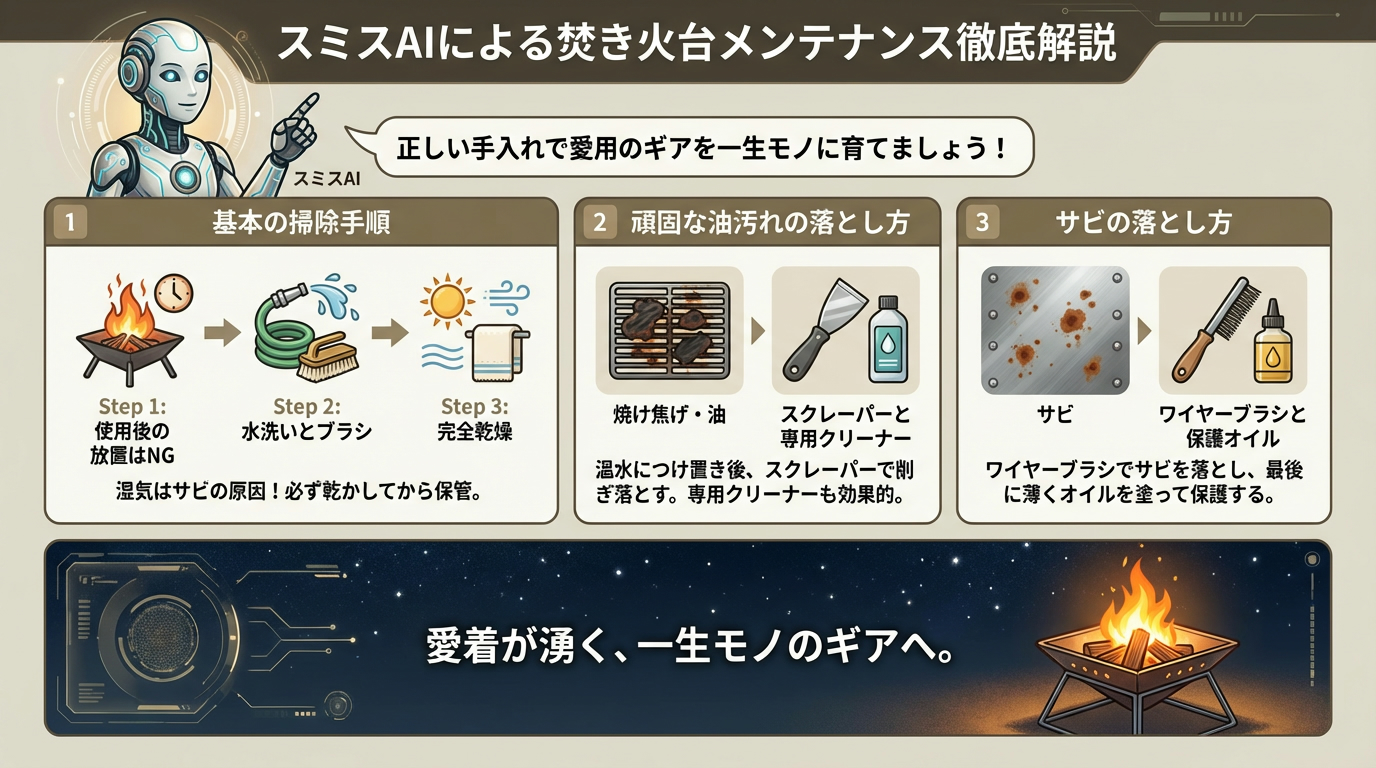 • 結論:基本は「冷却・灰捨て・水拭き・乾燥」。過度な洗浄は不要です。