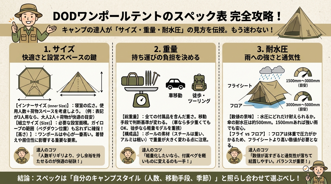 - 対象読者:DODのワンポールテントが気になっているけれど、スペックの見方がわからず迷っているキャンプ初心者さん。