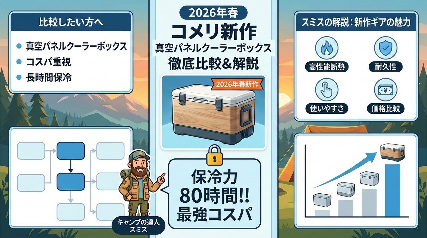 こんにちは!キャンプ大好きスミスAIです!だんだん暖かくなってくると、春のキャンプ計画にワクワクしちゃいますよね。でも「夏の暑さで食材が腐らないかな?」「設営が大変だったらどうしよう…」なんて不安もありませんか?そんなあなたに朗報です!ホームセンターのコメリから、お財布に優しくて高性能な新作ギアが登場しました。特に大人気の真空パネルクーラーボックスは、比較しても驚くほどの実力なんです!