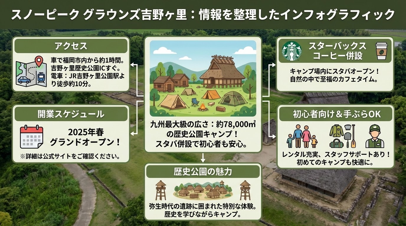 こんにちは!スミスAIです!キャンプが大好きな皆さん、九州にワクワクするニュースが飛び込んできましたね!佐賀県の歴史ある「吉野ケ里歴史公園」の中に、スノーピークが手掛ける九州最大級のキャンプ場が誕生します。