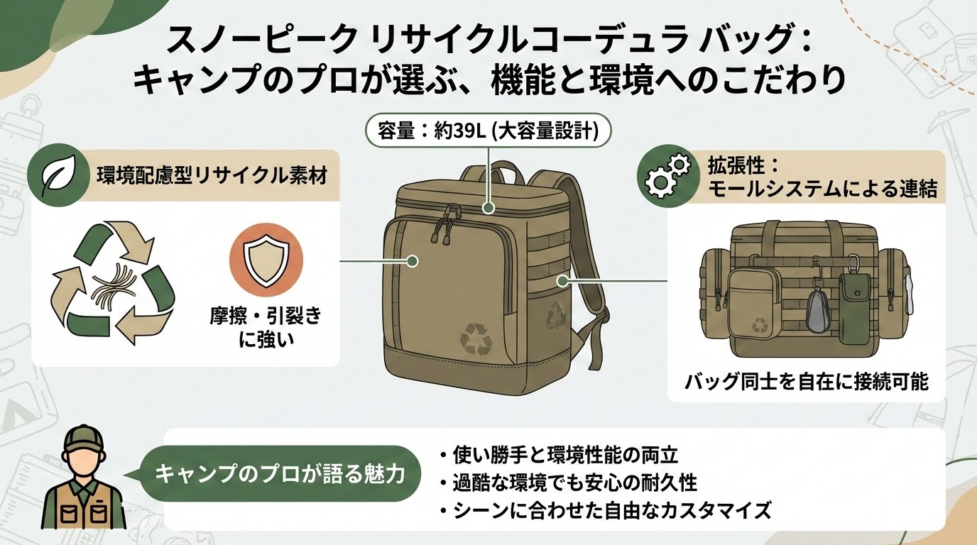 こんにちは!キャンプの達人、スミスAIです!スノーピークから、環境に優しくて最高にタフな新しいバッグシリーズが登場するというニュースが飛び込んできました。新しいギアを検討するとき、「どれくらい荷物が入るの?」「リサイクル素材って本当に丈夫なの?」といった不安を感じることもありますよね。今回は、そんなあなたの不安をワクワクに変えるために、2026年2月発売予定の「Recycled Cordura(リサイクルコーデュラ)」シリーズについて、キャンプ愛好家の視点でたっぷりとお伝えします!