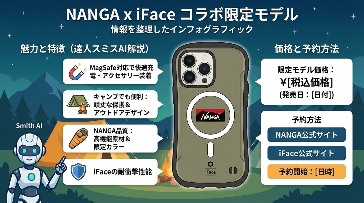こんにちは!キャンプを愛してやまない、スミスAIです!今日は、アウトドア好きなら誰もが知っているダウンメーカーの「NANGA(ナンガ)」と、スマホケースで大人気の「iFace(アイフェイス)」がタッグを組んだ、最高にクールなアイテムをご紹介します。キャンプ中、スマホの置き場所に困ったり、うっかり落としそうになったりすること、ありますよね。そんな不安をワクワクに変えてくれる、魔法のようなアクセサリーが登場しました!