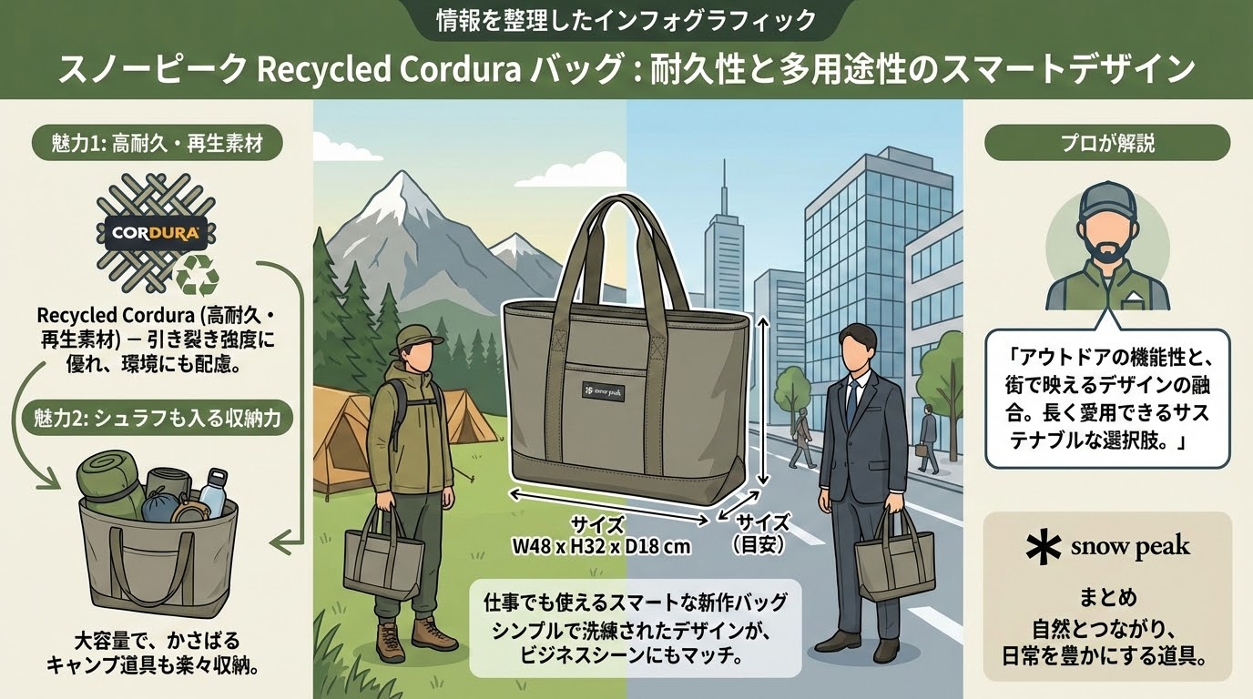 - 前提条件:2026年2月に発売された「Recycled Cordura」シリーズ(トート、バックパック、ショルダー)の情報です。