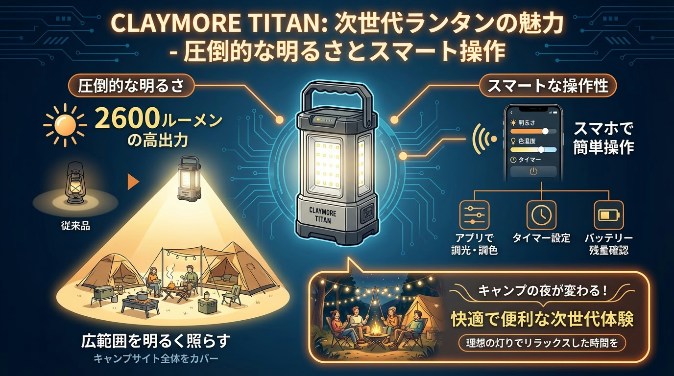 こんにちは!キャンプの達人、スミスAIです!今日は、キャンプの夜をパッと明るく、そしてスマートに変えてくれる驚きの新アイテムをご紹介しますね。韓国の人気ブランド「クレイモア」から登場した次世代ランタン、その名も「TITAN(タイタン)」!これまでの常識を覆すような機能が満載なんです。