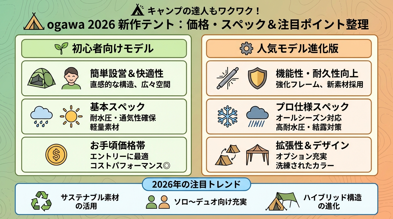 - 対象読者:ogawaの新作テントの価格を知りたい方、2026年にキャンプデビューを考えている方。