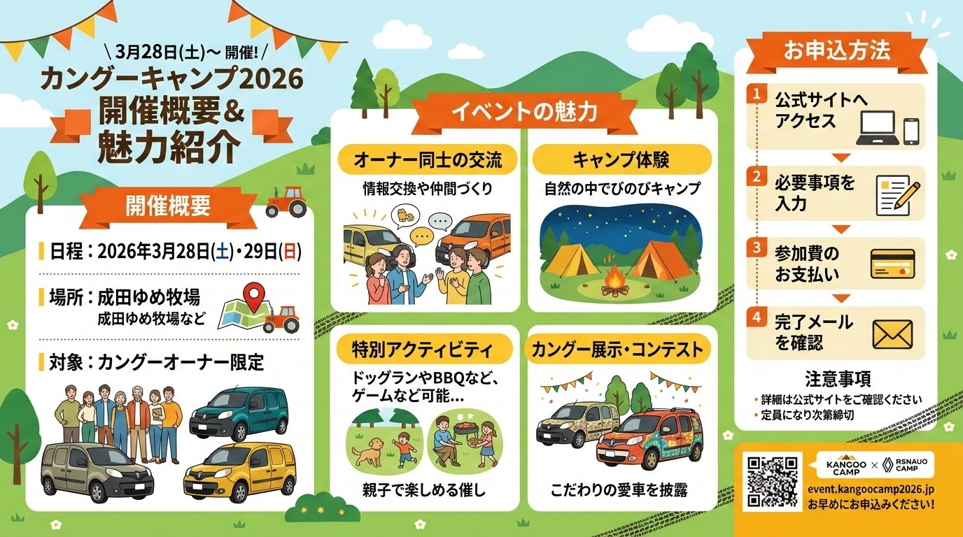 ルノー・ジャポンが、カングーオーナー様限定のキャンプイベント「カングー サクラキャンプ 2026」の開催を発表しました。今回は「サクラキャンプ」という名前の通り、桜の開花が予想される時期に合わせた素敵な企画です。同じ愛車を持つ仲間と過ごす時間は、きっと特別な思い出になりますね。