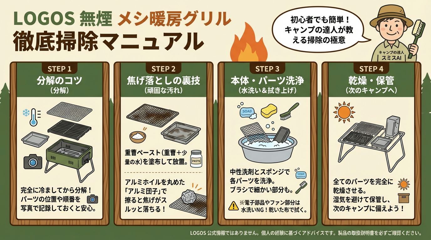 LOGOS 無煙 メシ暖房グリルの掃除方法と分解のステップ