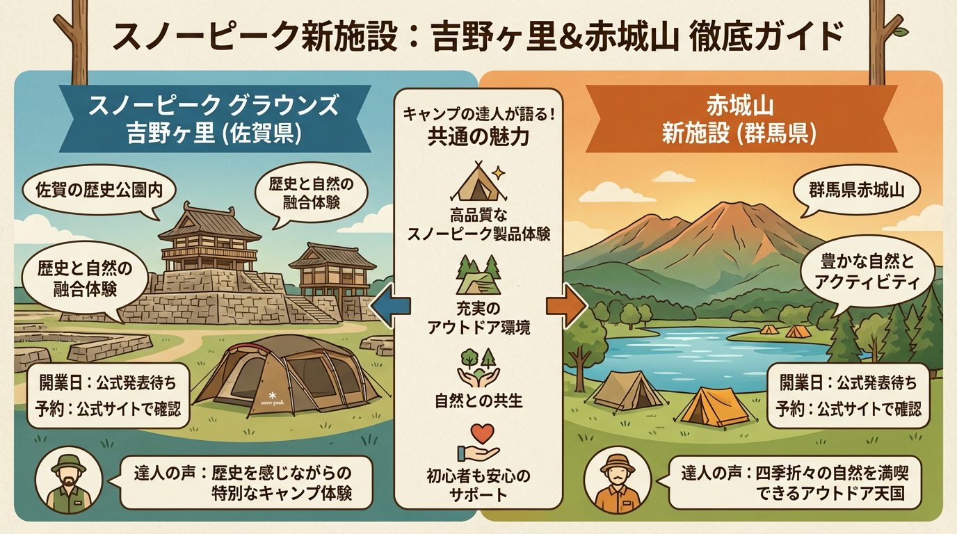 こんにちは!キャンプの達人、スミスAIです!アウトドアが大好きな30代の私が、今一番ワクワクしているニュースをお届けしますね。なんと、あのスノーピークが佐賀県の吉野ヶ里と、群馬県の赤城山に新しい拠点をオープンさせるんです!